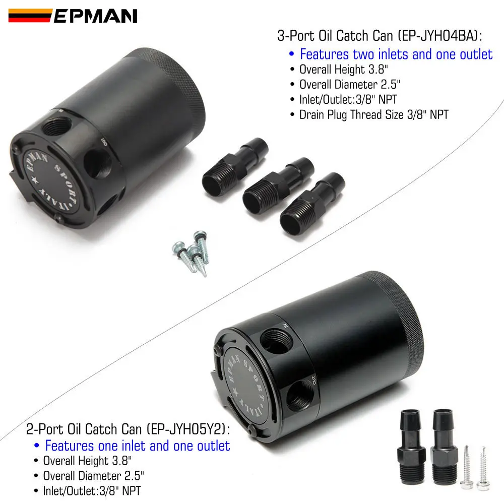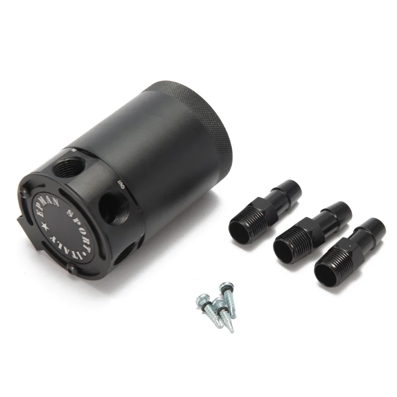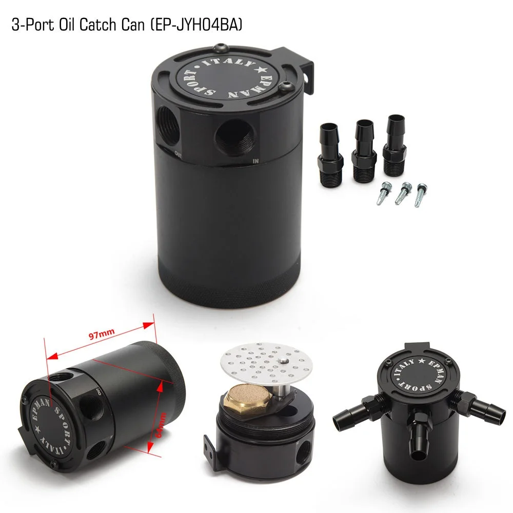 ![]() | EP-JYH04BA | •Type: 3-Port Oil Catch Can • Features two inlets and one outlet • Overall Height 3.8" • Overall Diameter 2.5" • Inlet/Outlet:3/8" NPT • Drain Plug Thread Size 3/8" NPT • Oil Capacity:2 fluid ounces • Material: 6061 aluminum • Package:1PC Aluminum Oil Catch Can (Necessary fitting as picture ) |