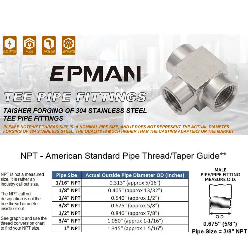 EPMAN 1/8 NPT Female Pipe T Tee Fitting 3 Way SS304 Fitting For Fluid Transfer, Vacuum Line, Fuel Pump, Oil Cooler etc. EPCGQ235